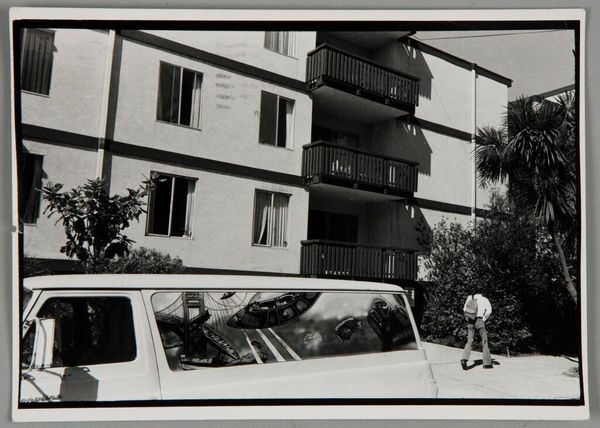 Curator: Bill Dane's "Untitled (Berkeley)" presents us with a strikingly geometric yet organic study of urban space. Editor: It's like a stage set, almost theatrical, this black and white image. The light is soft but the lines are so sharp. Curator: The interplay of natural and man-made forms is central, isn't it? The tree's limbs mirroring the staircase railings. Editor: Absolutely. And the cracked glass pattern near the stairs feels so very... Californian. A bit broken but still beautiful. Curator: Considering Dane's tendency to mail his photographs, one might wonder if this scene resonated with him on a personal level, a snapshot of his everyday. Editor: Perhaps he saw in that jumble of shapes a kind of abstract portrait, the essence of a place captured in a single frame. Curator: It’s a quiet photograph, that speaks volumes. Editor: Yes, it does, a quiet, melancholic melody.