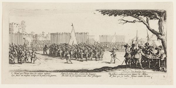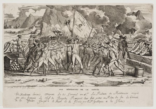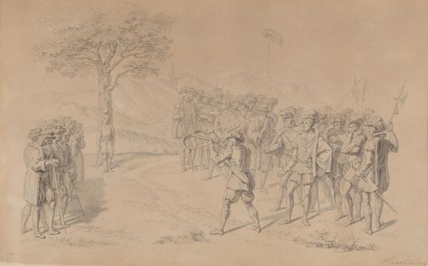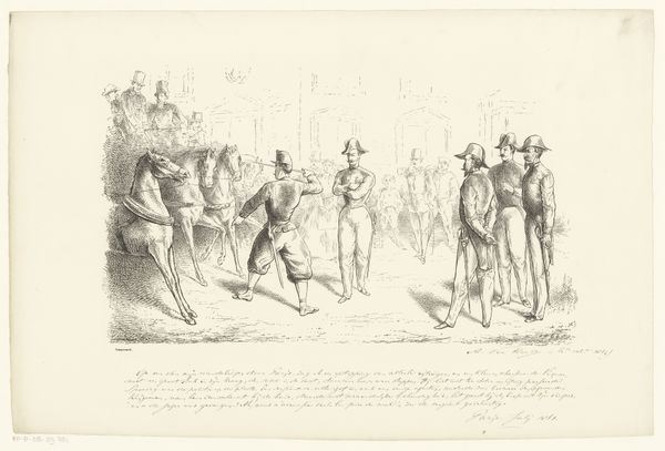 Curator: Welcome. Here we see "l'Entrevue des deux Empereurs," an engraving completed in 1805 by Gerhard Ludvig Lahde. Note how Lahde utilizes the precision of line to capture this pivotal moment. What is your immediate impression of the work? Editor: It feels undeniably charged with tension. The composition, split between the central figures and their flanking entourages, speaks of a fragile accord built on a field of power. It begs the question of how and why. Curator: Precisely. The controlled hatching technique creates form and depth, directing the eye towards the two emperors at the center. The contrasting textures – the smoothness of their coats against the ruggedness of the landscape – invites scrutiny of each figure's presence. Editor: And consider the date, 1805. Napoleon’s ambition was reshaping Europe, and alliances were tenuous things, built upon pragmatism rather than genuine camaraderie. Lahde encapsulates that precarious balance. This isn't simply a meeting, it's a performance of power. Who benefits and how is written into every line. Curator: I see your point about the performance. One might suggest that the subtle differences in their postures reflect their contrasting styles of leadership. Alexander I appears to offer a slightly more open hand. What does this subtle gesture say to us? Editor: Exactly! It suggests diplomacy, perhaps a forced graciousness toward Napoleon’s undeniable strength, visualized in the comparatively bolder lines and stance. We cannot divorce this encounter from its impact upon colonized lands and those living in poverty at the time. These types of arrangements consolidated elite power and continued a legacy of inequity for marginalized peoples around the globe. Curator: This adds another layer, then, highlighting not only personal dynamics but the broader impact of their actions. I think it is vital we continue to discuss artwork from this era through the many points of view the world now has. Editor: Agreed. By critically engaging with Lahde’s engraving, we unlock these potent questions of influence, intention, and consequence across time. Curator: A nuanced examination of form, informed by sociopolitical awareness—an enriching way to consider works such as this one.