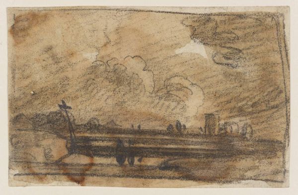 Curator: Here we have Alexander Cozens' "A Wood. Blot" from the Tate Collections. It’s a landscape study rendered with a unique ‘blot’ technique. Editor: It feels like a memory, doesn’t it? A whisper of a place, rendered in sepia tones—nostalgia bottled in brown ink. Curator: Indeed. Cozens' method emphasizes the abstract foundation of landscape, reducing forms to essential tonal relationships. Note how the composition pivots around the interplay of light and shadow. Editor: See how the trees merge into a singular, almost brooding, entity, obscuring any sense of depth? It's less about geographical accuracy and more about emotional resonance. Curator: Precisely. Through this reduction, Cozens invites viewers to project their own associations and imaginings onto the scene. Editor: It almost feels like a stage set, incomplete yet evocative, leaving the imagination to fill in the blanks. Curator: Ultimately, Cozens provides a template for subjective experience. Editor: Like catching a fleeting moment, the essence of a landscape lingers in the mind’s eye.