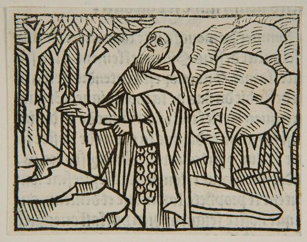 Curator: Look at this woodcut, “Saint Mary of Egypt,” by an anonymous artist, housed here at Harvard. It’s such a stark image, isn't it? Editor: Yes, the high contrast between the black lines and the pale background makes it feel almost… oppressive. The figure looks trapped within the heavy lines. Curator: The composition is quite striking. Mary kneels, clutching her rosary, framed by what seems to be a building and a very harsh landscape. Editor: Indeed, this aesthetic choice really speaks to how women, and especially penitent figures, were often framed by societal expectations and religious doctrines that emphasized suffering and seclusion. Curator: I wonder what story the artist wanted to tell? It feels intimate, melancholic, but also strangely powerful. Editor: It’s a story of repentance, but also resistance. The woodcut’s simplicity invites us to question the stories we tell ourselves about saints and sinners.