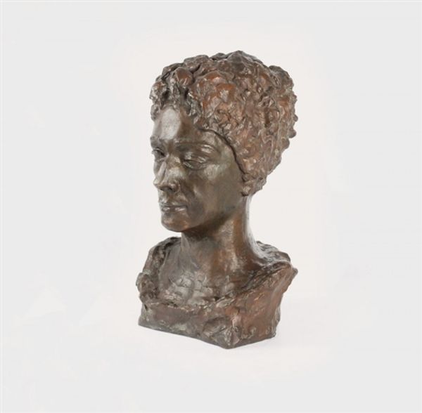Editor: This bronze bust, titled "Mrs Macloghlin" by Sir Alfred Gilbert, really captures my attention. There is something very regal about the way she holds her head. What narratives do you think this piece is trying to convey? Curator: Well, consider the late 19th century. Gilbert was working within a society grappling with shifting class structures and gender roles. The ornate headwear, her confident gaze... it speaks to a certain assertion of identity. How does her gaze challenge or subvert expectations of women at the time? Editor: It's like she's daring you to look, refusing to be passive. Curator: Exactly. Gilbert was known for pushing boundaries. This sculpture isn't just a portrait; it’s an intervention into the social dialogues of its time. I wonder, what does her expression evoke for you? Editor: A quiet strength, maybe even defiance. Thinking about it that way, it makes the sculpture feel much more complex and powerful. Curator: Precisely. Art becomes a potent tool when we recognize its dialogue with the society that births it.