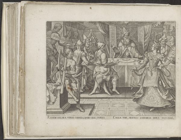 Johannes or Lucas van Doetechum created this engraving, "Daniel before King Nebuchadnezzar," an intricate play of linear perspective and architectural detail. The scene, dominated by the king enthroned under a canopy, is balanced by the figure of Daniel in the foreground, creating a dialogue across the pictorial space. The architectural rendering, with its receding arches and tiled floors, crafts a sense of depth that draws the eye into the composition. Light and shadow are employed not merely to define form but to create a visual rhythm across the surface. The semiotic significance of these elements lies in their capacity to evoke the grandeur of the Babylonian court and the tension between divine prophecy and royal power. Consider how the spatial arrangement subtly undermines a straightforward reading of power dynamics. The strict lines of the architecture and the controlled distribution of figures serve as a powerful reminder that meaning is not simply represented but actively constructed through formal devices.
