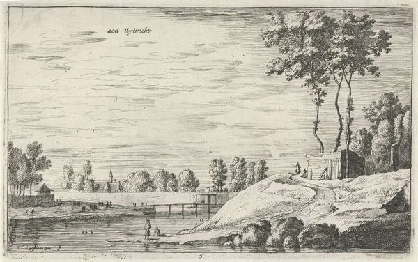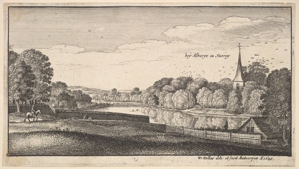 Wenceslaus Hollar made this print titled 'View Near Albury' in 1645 using etching. The serene scene of the English countryside belies a period of immense social and political upheaval. Made during the English Civil War, Hollar's landscapes offer an interesting perspective on the conflict. Hollar worked for aristocratic patrons. The orderly landscapes can be seen as a commentary on the desired social order, one threatened by the ongoing conflict between the monarchy and parliament. The detailed rendering of the landscape, a valued commodity and a signifier of wealth and status, emphasizes what was at stake for the elite during this tumultuous time. The church spire signals the importance of religion in the war's conflict. To fully appreciate Hollar's work, we need to consider the historical context. Researching the patronage system, social hierarchies, and political ideologies of 17th-century England helps us understand how art served as a reflection and commentary on society.