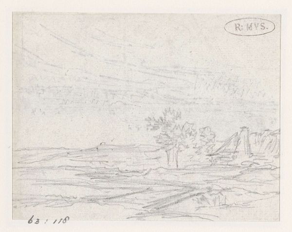 Editor: This is "Krabbel van twee molens (Montmartre)" by Georges Michel, created sometime between 1773 and 1843. It's a drawing, pencil and ink I think. It has the feeling of a quick sketch, very simple, almost childlike. What do you see in this piece? Curator: I see the winds of change sweeping across Montmartre, literally and figuratively. This isn't just a landscape; it's a whisper of the social and economic transformations occurring in late 18th and early 19th century France. Michel captures a rural scene, but those windmills… They're a symbol of labor, of a changing economy, and the exploitation inherent in industrial progress. What kind of dialogue can we build between then and now, about our current reliance on technology and the environmental cost we pay for progress? Editor: Exploitation of labor? I see what you mean, but wouldn’t that be a later view of windmills as representing industrialization? This looks almost romantic. Curator: Exactly. The Romantic period looked to the past – and nature - to critique contemporary industrial life. But is it innocent nostalgia, or a coded critique? Consider the politics of landscape – who had access to this land, and who benefitted from its resources? Michel’s seemingly simple sketch opens up avenues to discuss land ownership, social justice, and the hidden narratives within landscape art. It’s asking, subtly, for whom does the wheel turn? Editor: So it’s not just a pretty picture; it's asking deeper questions. I’m realizing that there’s so much context that impacts our perception of art. Curator: Precisely! Art is never created in a vacuum. When we approach it through a lens of historical and social awareness, we start to unpack its profound connection to human experience and that of course enhances our present experiences, too.