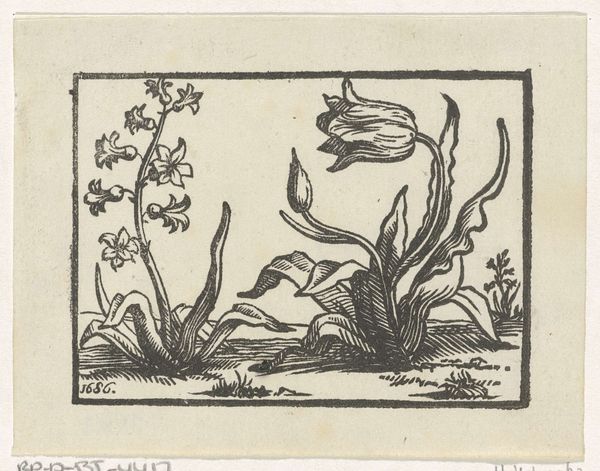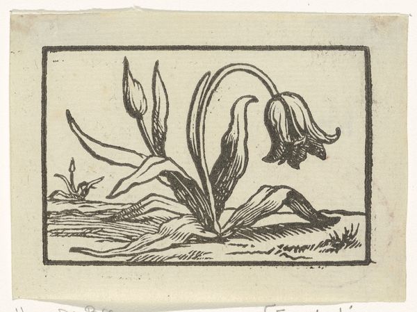 Curator: Let's turn our attention to this captivating print from 1661 by Dirck de Bray, entitled "Tulp in bloei," which translates to "Tulip in Bloom". Editor: It's strikingly simple. The heavy black lines of the woodcut give it a somber quality, almost meditative, despite depicting a flower. The droop of the single blossom feels weighty. Curator: That's interesting. The tulip, during the Dutch Golden Age, became associated with the transience of beauty, excess, and a reminder of mortality in the face of the infamous Tulip Mania. Editor: Of course, that resonates! You can see the symbol of “memento mori” at work. The almost skeletal, bare presentation mirrors this underlying concept, acting as a reminder about life’s ephemeral qualities. Even the earth it grows from looks bleak and barren. Curator: De Bray himself lived through periods of both financial prosperity and severe financial hardship, which would certainly inform his views on excess. Given that some scholars link Dutch flower paintings with prosperity and national identity in a globalizing world, this rendering in printmaking perhaps makes it more widely accessible and democratizes access to an affluent object of status, no? Editor: I think that reading has legs. A single flower rendered starkly like this… almost a photographic negative in some ways… becomes universal. Stripped of opulent color, the meaning shifts to wider themes of beauty and life’s precariousness, independent of monetary privilege. The contrast between what was, what is, and what will be can make you really feel the precarity of existence. Curator: And it invites conversations about environmentalism as well, particularly given the exploitation of nature during that period, and ours. Thank you, that’s quite the way to look at a humble plant, I am glad to hear your take. Editor: My pleasure. I find its haunting, stripped-down nature lingers in my mind long after I turn away, something more than just botanical art.