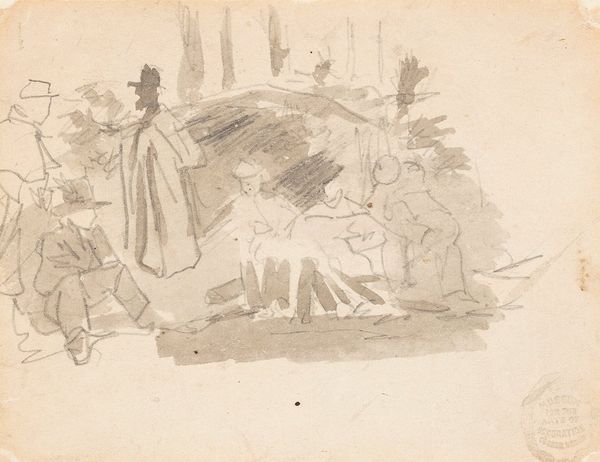 Curator: Sanford Robinson Gifford's "Two Seated Soldiers," presents us with a delicate pencil sketch, likely a study for a larger work. The dimensions are intimate, only about 10 by 15 centimeters. What's your first impression? Editor: The composition feels unresolved, almost melancholic. The visible pencil strokes emphasize a sense of immediacy, but also of incompletion. I'm drawn to the raw materiality of the paper. Curator: Indeed. Given Gifford’s later landscapes, celebrated for their luminism, this work provides valuable insight into the Civil War's impact on artists and their evolving visual language. We must also consider how the soldiers' postures embody exhaustion and resignation. Editor: Absolutely. And thinking about the production process, one wonders about the availability of art supplies during wartime, which could contribute to the sketch-like quality, prioritizing function over polish. Curator: It’s important to recognize how these subtle depictions challenge romanticized notions of war, offering instead a glimpse into the everyday realities of soldiers whose identities were often marginalized. Editor: Precisely. By focusing on the means of production, and by examining the raw materials, we can challenge historical erasures and build a more inclusive art history. Curator: This sketch invites us to delve deeper into the lives of these overlooked figures, to understand their experiences through the lens of art. Editor: Yes, and appreciating the unpolished, immediate quality lets us rethink traditional definitions of artistic value.