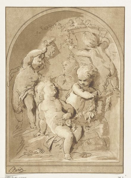 Louis Marin Bonnet created "The Air: A Group of Three Putti on Clouds" using red chalk. The texture, achieved through fine hatching, gives a soft, dreamlike quality to the figures. The composition is organized around a cluster of cherubic figures resting on billowing clouds, creating an ethereal scene. The careful arrangement of the putti and clouds isn't just decorative; it speaks to broader artistic and philosophical ideas of the 18th century. During the Enlightenment, the representation of air as an element was used to convey ideas about lightness, freedom, and intellectual thought. Bonnet uses the putti as signs, their cherubic innocence set against the vastness of the sky and the promise of enlightenment ideals. Note the lines of the clouds, and the way the artist has used parallel lines and hatching to create depth and volume. It's a visual system – an almost semiotic structure, in which clouds and putti are carefully constructed to evoke particular meanings. This engraving functions not just as a piece of art but as a cultural artifact, reflecting the evolving discourse of its time.