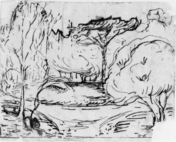 Vincent van Gogh made this work, Study of a Fruit Tree, using a reed pen and ink on paper. The drawing comes across like a forceful, restless interpretation of the natural world. Van Gogh’s art training in the Netherlands and Belgium involved rote copying and a sense of realism appropriate to the market for popular prints. However, his encounter with Impressionism in Paris during the mid-1880s encouraged him to think of nature as a stimulus for personal expression. The image is not a straightforward depiction, but rather a stylized interpretation, as you can see in his expressive and energetic drawing style. Van Gogh sought to reflect the raw, untamed qualities of the landscape, rejecting academic artistic conventions. He creates a sense of vitality in his work, suggesting that art could represent the dynamism of life itself. Art historians use letters, biographies, and exhibition reviews to get a clear picture of the cultural and institutional context in which such works were made. This artwork remains a testament to the artist's unique perspective and innovative approach to art-making.