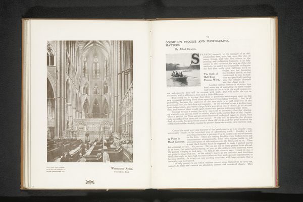 This is a photographic print of the interior of the Collegiate Church of Our Lady and Domitian in Huy, made by Victor Gaillard, likely toward the end of the 19th century. The image is interesting in its use of visual codes to create meaning, as the church itself would have carried immense cultural and historical associations for the Belgian people of that time. The Collegiate Church, with its towering columns and intricate Gothic architecture, represents centuries of religious tradition and community identity. Images of churches such as this served a public role, reinforcing social and cultural values. Gaillard's photograph captures the architectural grandeur of the church but it also subtly critiques the institutions of art. The photograph is presented as an image within a book. Understanding this image better requires exploring the historical context of the late 19th century in Belgium. Research into the social conditions, religious practices, and political movements of the time would illuminate the deeper meaning of this artwork.