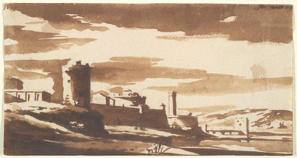Curator: Jacob van der Ulft's drawing, "Ein römisches Theater bei einer Brücke," now held at the Städel Museum, offers us a sepia-toned glimpse into a past era, though its precise date remains unconfirmed. Editor: Immediately, the chiaroscuro effect strikes me. The deep shadows contrasted with the brilliant, almost blinding, highlights evoke a powerful sense of drama and transience. Curator: Yes, van der Ulft masterfully employs ink and watercolor to portray not just the ruins themselves but also the weight of history bearing down upon them. Notice the careful depiction of architectural elements mingled with the raw energy of nature's brushstrokes. Editor: The ruins feel… incomplete, disrupted. What was once orderly is shown to be subject to entropy. Even the singular figure atop the column appears to be casting its gaze backwards rather than moving into the future. The bridge almost melts into the background, perhaps symbolizing its disuse. Curator: Indeed. Bridges are often interpreted as liminal spaces, but here it lacks its functional symbolism and blends almost perfectly with what appears to be its natural environment, symbolizing perhaps, its lost role in the connectivity between humans. And yet, isn’t there a hint of defiance as the theatre continues to impose on its landscape even with time wearing it away? The ruins hold layers of stories from past civilizations to this moment. Editor: Defiance, perhaps. Or maybe a wistful echo. The washes of ink lend the scene a dreamlike quality, as if we’re not merely observing a historical site but witnessing a memory fading away. I am left reflecting on how structure is ultimately consumed, both physically, but perhaps psychologically. Curator: Absolutely. The drawing invites us to reflect on how physical spaces shape and are shaped by memories. To be confronted with history through Van Der Ulft's work feels like unlocking a secret of cultural legacy passed down through art. Editor: It's a potent reminder of impermanence, isn’t it? That all grand structures, whether literal or metaphorical, are destined for the same fate. A truly thoughtful and subtly melancholic piece.