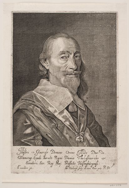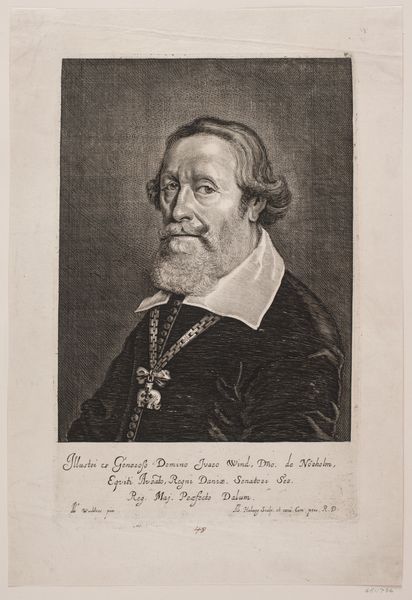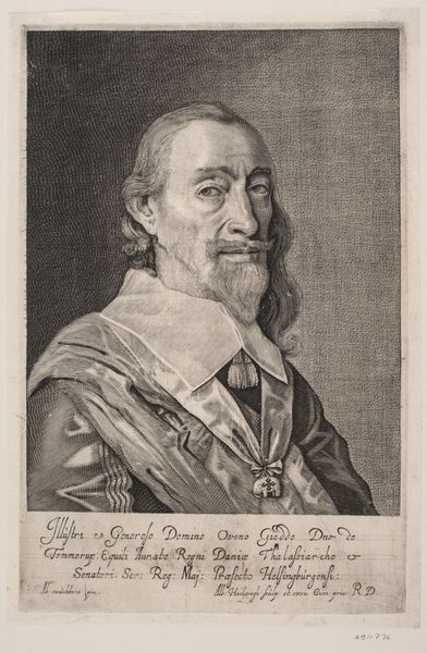 Editor: This is a portrait of Mogens Høg, made between 1655 and 1659 by Albert Haelwegh, using engraving. It feels very… official, like a depiction meant to convey power and status. How do you interpret the work within its historical context? Curator: Well, consider the power dynamics at play here. Haelwegh was creating an image of a Danish senator, a man holding considerable authority. Prints like this were often commissioned to disseminate an image of power. How does the senator's pose and attire contribute to this perception of authority? Editor: His gaze is direct and confident, and the collar is very formal. All those tiny buttons on his coat, too! It speaks to wealth, but I am guessing it also has a function to mark status within courtly or political circles. Curator: Exactly. In the context of 17th century Denmark, sumptuary laws often dictated who could wear what. These weren't simply fashion statements. They reinforced social hierarchies. Also, notice the text at the bottom. How does that add to our understanding? Editor: It seems to list Høg's titles and positions - Senator, Prefect of Silkeborg. Almost like an official record accompanying the portrait. This emphasizes his public role, wouldn't you agree? Curator: Precisely. The engraving served to legitimize and reinforce his position within the Danish power structure, extending his reach beyond his physical presence. So it's not just a pretty picture. It's part of the machinery of state. Editor: It is fascinating to consider how art serves these various public functions and to recognize the extent to which portraits acted as official and political instruments. Thank you for providing this framework for analyzing this historical portrait! Curator: My pleasure. Remembering the social and institutional functions of art can change the way we engage with it today.