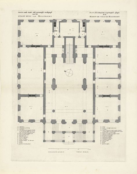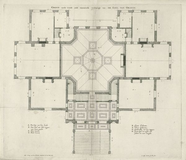 Nicolaes Ryckmans created this ink drawing, titled "Floor Plan of the Ground Floor of the Villa Giustiniani-Cambiaso in Genoa," sometime in the 17th century. This floor plan offers us a window into the spatial organization and social dynamics of a wealthy Genoese family's residence. The symmetrical layout, with its grand entrance, suggests a concern for appearances and the projection of power. It is not merely a functional arrangement, but a carefully orchestrated performance of status. Genoa, a maritime republic, was a hub of trade and finance during this period. This economic prosperity likely fueled the construction of elaborate villas like this one. Architectural drawings like this one would have been important tools, both for the families who commissioned these buildings and for the architects who designed them. To understand the drawing fully, architectural historians consult period documents, such as estate inventories and social histories. This provides a richer understanding of the cultural significance of spaces and the lives of those who inhabited them.