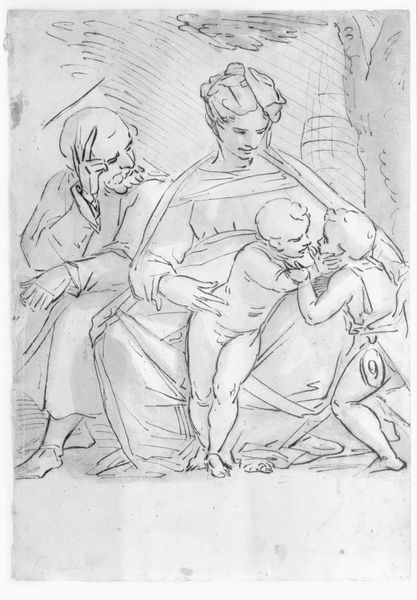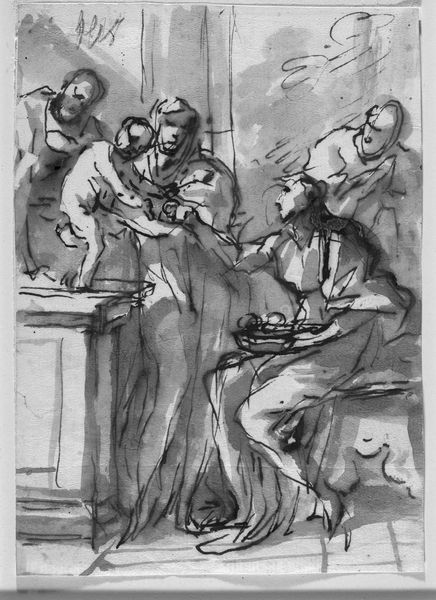 Editor: Here we have Domenico Brandi's ink drawing, "Same subject traced from the recto," created sometime between 1684 and 1736. I find the grouping of figures intriguing, yet the linework appears so raw and unfinished. What strikes you most about this sketch? Curator: The preliminary nature of the sketch allows us to see Brandi's process explicitly. Notice the economy of line, used not to describe volume precisely, but to delineate shapes and suggest a spatial arrangement. The composition itself seems to prioritize the overall balance of forms rather than anatomical accuracy. Observe how the artist arranges the figures; there's a deliberate interlocking, creating a sense of unity. How does that linearity create visual weight? Editor: The consistent line weight does give it a sense of flatness. Do you think he was interested in foreshortening at all? Curator: The handling of the figures, particularly their poses and gestures, suggests an attempt at depth, but ultimately the emphasis is on the surface. There’s a deliberate obscuring, with each line contributing to a totality where clarity or depth becomes secondary. In formal terms, we might consider how the rough outline of the paper complements the incompleteness of the figures, creating a sense of a fleeting moment captured. Do you see the shadow beneath, a subtle compositional support? Editor: I see what you mean about the interlocking shapes, and it really brings cohesion to what at first glance seemed rather haphazard. I now see the importance of analyzing the raw form. Curator: Exactly. This drawing offers us insight into how Brandi utilizes fundamental formal elements to communicate and gives us license to bring our own interpretation into it as well.