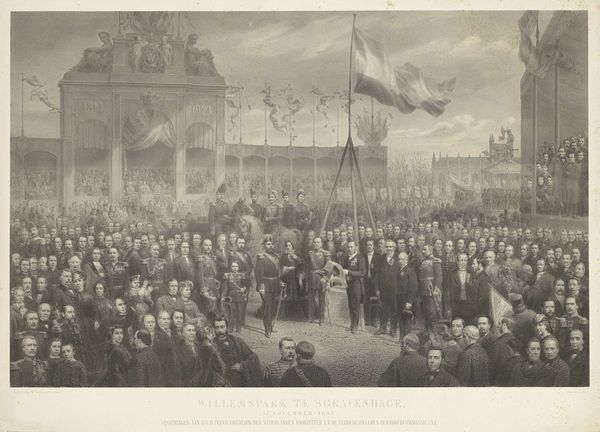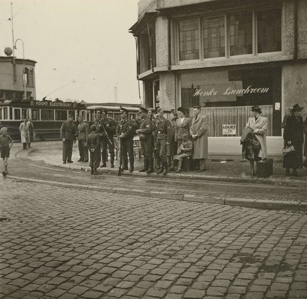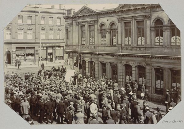Editor: This is a photograph from 1898, "Procession with Religious Images on the Kremlin," a gelatin silver print by Henry Pauw van Wieldrecht. It gives me such a somber, almost… spectral feeling, watching this procession from so long ago. The figures feel anonymous, swallowed up by time. What captures your attention most when you look at it? Curator: Well, first off, it’s the way the photographer has captured light and shadow. See how the icons practically shimmer against the rather austere Kremlin architecture? The sacred attempting to penetrate the secular, if you will. Does it strike you as intentional, almost theatrical? I mean, imagine the weight of those icons, both literal and symbolic, on the carriers. Editor: Absolutely, that contrast is really striking. It does feel almost staged, but I suppose any photograph freezes a moment and imbues it with a certain significance. The blurred faces add to that feeling of timelessness, too. Is that part of the appeal? Curator: For me, it's the glimpse into a past way of life. Think of Russia at that time, teetering on the edge of massive social and political upheaval. These icons aren’t just decorative; they’re totems of faith, hope, and tradition in a world that’s about to change irrevocably. Almost poignant, isn’t it? What will persist, the photographer seems to ask? Editor: So, in a way, it's not just a religious procession; it's a symbol of a society on the brink? I guess that somberness I felt was the weight of history bearing down. It’s quite humbling to think about, really. Curator: Precisely. A simple photograph, and yet… loaded, shall we say, with unspoken narratives. Something to mull over, definitely.