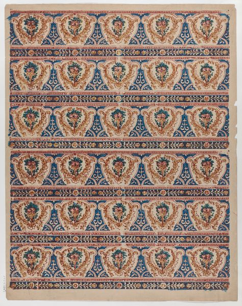 Editor: This furnishing fabric, "Le Mariage," dates to around 1810, and is credited to Jean-Baptiste Mallet. It looks like a print on textile, a repeating pattern with these classical figures and architectural motifs. The red background is quite striking. What stands out to you about this piece? Curator: The material reality of this fabric, its creation, and its use in furnishing speak volumes. It’s easy to focus on the "history painting" aspect, but consider the social implications. Who could afford such a fabric? What was the labor like that produced it? Was it locally produced or imported? Editor: That’s a really good point. I was focusing on the scenes depicted, assuming they related to high art. I didn't even think about how the fabric itself might reflect the social hierarchy. So the images are secondary to the material itself? Curator: Not secondary, but consider how the image *functions* when mediated through the material. History painting reproduced for domestic consumption shifts its meaning entirely. It moves out of the museum or gallery and into the home, suggesting a democratization of art…or perhaps, a commodification? Notice the precision of the weaving or printing - a high degree of skill, regardless. Editor: I guess I hadn’t really thought about it as a commodity before. I suppose this challenges the idea that "art" exists separately from everyday life, right? That something functional can be high art too. Curator: Exactly. Think about the division of labor inherent in producing textiles versus paintings. One is often communal and the other individualistic. We must ask ourselves: who decides what’s “art” and what’s merely craft? It shows the art's function. Editor: This completely changed my perspective! I will definitely remember to think more about the production and purpose of art in relation to society and economy. Thanks for showing me that today. Curator: It’s crucial to understand art's production to see the larger cultural context at work, yes, exactly.