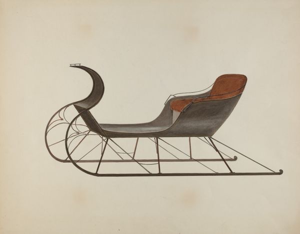 Curator: The decorative art on display here, aptly named *Doll Sleigh*, was completed circa 1937 by Beverly Chichester, in watercolor and drawing. Editor: There’s a charm in this simplicity. The vibrant reds juxtaposed against the off-white ground feel almost nostalgic, reminiscent of vintage toy advertisements. The whole thing possesses a slightly faded grandeur. Curator: That faded quality is important. The floral motifs, which echo across the frame, tie this piece to folk traditions and to memory itself. Notice how these blossoms often function as carriers of localized, cultural, and even personal meaning. What does this design imply about the identity and place of this piece? Editor: The use of watercolour and drawing seems well suited to evoke nostalgia. In that sense the execution complements its apparent cultural messaging. The soft bleed of pigment generates visual dynamism, lending an ephemeral quality, that somehow captures time elapsing. Look how the delicate lines of the floral design are offset by bold geometric structures defining the form. Curator: Chichester leverages precisely these formal dynamics to construct a familiar and yet deeply personal narrative. She engages archetypes while grounding it in very palpable historical terms. This interplay of cultural symbolism and structural expression generates profound meaning. Think of childhood innocence and, in counterpoint, aging. Editor: And yet, despite my appreciation, I feel its visual language to be rather straightforward; maybe a touch conventional for its time? I miss a layer of intentional subversion or deconstruction. Something challenging. Curator: Challenging perhaps, but also affirming of continuity and collective memory. Art isn’t solely about groundbreaking reinvention. Sometimes its purpose is simply the perpetuation and transmission of beauty and cultural wisdom. Editor: I will concede to the warmth it evokes; perhaps its charm does outweigh the lack of experimentation. It functions more as a sentimental marker of bygone eras than an artistic avant-garde declaration. Curator: Well, in encountering the *Doll Sleigh* you’re essentially stepping into an artifact carrying with it both a decorative allure, and more poignant threads connecting us to past times. Editor: Absolutely. Its technical execution and overt sentimentality offer us much to reflect upon when we study our connections to tradition.