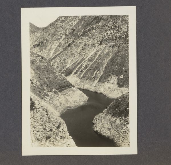 Curator: Here we have an albumen print by Onnes Kurkdjian, dating from around 1895 to 1915. It depicts the "Kratermeer op het Idjen Plateau, Java, Nederlands-Indië" – or, Crater Lake on the Ijen Plateau, Java, in the Dutch East Indies. Editor: It strikes me as bleakly majestic. The somber tones really emphasize the stark geological drama—that towering, craggy rock face dominates the composition. Curator: Indeed. Consider that photography of this kind, during the colonial era, played a significant role in shaping perceptions of colonized lands. Kurkdjian’s work, presented within albums, offered Europeans a seemingly objective view of Java's landscapes, which bolstered colonial narratives. Editor: It's interesting how the photographer uses light here. The contrasting light and shadow accentuate the textures of the rock and really pull your eye toward the center. The subdued tonality adds to the feeling of solemnity, even remoteness. Curator: Exactly, because those elements conveniently omit certain elements, you might say. We aren’t seeing laborers, extraction operations, or anything that might complicate the romanticized picture of an untamed, resource-rich colony ripe for the taking. Instead, you get the sublime of raw nature! Editor: It’s a compelling tension: the sublime natural form, meticulously rendered by an intricate chemical process. There is a fascinating, delicate texture to the albumen print, isn’t there? Curator: Certainly, that’s another component of its allure. These meticulously produced images were, in themselves, symbols of colonial power. They circulated within elite circles, reinforcing ideologies. Editor: Looking at this photograph today, divorced from its original context, one can appreciate it as a masterful exercise in monochrome landscape photography, a powerful arrangement of shapes and tones. But with an understanding of the period, you begin to see it differently, and the details really come to life! Curator: Precisely. When considering the history surrounding the image, that stark landscape becomes even more thought-provoking as a mediated representation deeply embedded in the politics and economy of colonialism.