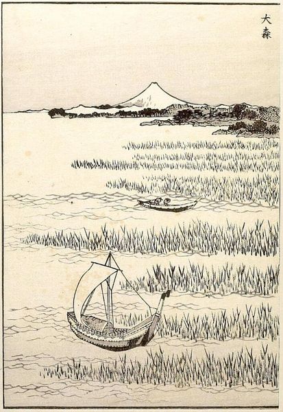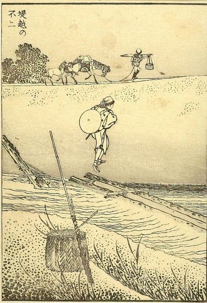 Curator: What a stark, yet captivating scene! This is "Fuji over a Bank" by Katsushika Hokusai, a woodblock print from his "One Hundred Views of Mount Fuji." Editor: The figures look burdened, but resilient. The line work feels both delicate and strong, and that tiny Fuji in the distance, dwarfed by daily life, creates a striking contrast. Curator: Indeed. Hokusai's "One Hundred Views" series wasn't just about landscapes, but about showing Mount Fuji as a constant presence in the lives of ordinary people. Editor: That’s it, it's a commentary on how we frame even the most majestic of symbols within our individual struggles, literally carrying the weight of existence while Fuji remains distant. Curator: Perhaps. Or perhaps it highlights the enduring and unifying power of shared cultural icons. Editor: Either way, the piece prompts reflection on the interconnectedness of landscape, labor, and identity. Curator: Hokusai's vision reminds us that even the grandest icons are grounded in the everyday. Editor: And that the everyday holds its own quiet grandeur.