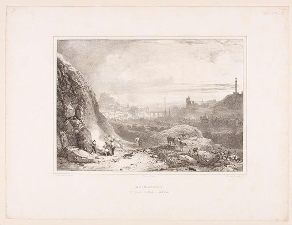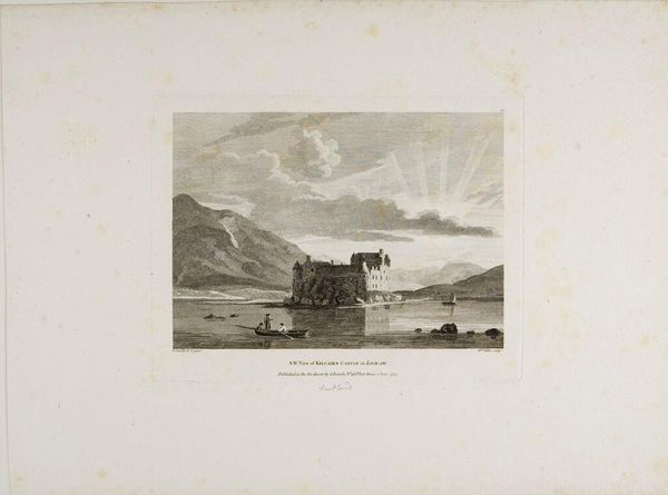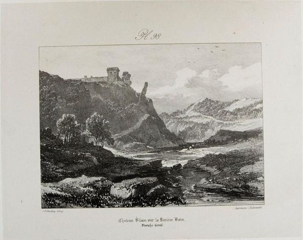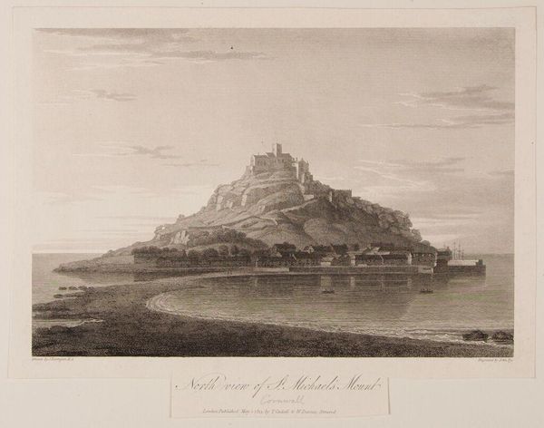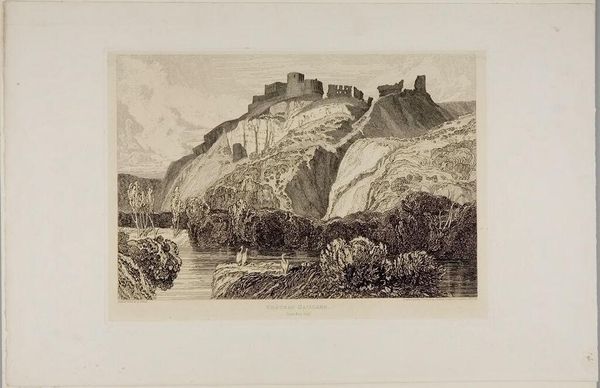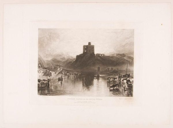 Curator: This is Charles Turner's "Norham Castle, on the Tweed." Look at that monochrome sepia wash, reminiscent of old photographs. It evokes a sense of distant memory. Editor: Immediately, I feel a strong pull towards melancholy. The castle on the hill, like a ruin in the mind, and the river suggests the passage of time, eroding everything. Curator: Turner was known for his mezzotints, and this work captures the historical weight of Norham, a border castle between England and Scotland. Notice how the reflections in the Tweed create a doubling effect. Editor: Yes, the reflections are so evocative. It is not just about space. They suggest echoes, where the past lingers and influences the present, an enduring dialogue between light and shadow. Curator: Indeed, Turner uses the castle as a symbol of resilience, a structure standing the test of time amidst shifting political and geographical landscapes. Editor: It leaves me pondering the narratives this landscape holds and how it subtly invites us to contemplate our own legacies.