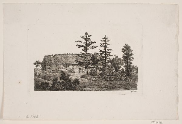 Curator: Welcome! Here we have "En grandskov", dating roughly from 1788 to 1860, held here at the Statens Museum for Kunst. This work, a landscape, is rendered as an engraving. Editor: The first thing I notice is how… contained it feels. The frame within a frame effect of the print's edge creates an intimacy. There's something serene but also perhaps slightly melancholic about the monochromatic tones. Curator: Yes, let's consider the tonality and line work. The density of the engraved lines varies dramatically to suggest light and shadow, volume, and recession into space. The foreground, for example, employs a much more detailed hatching than the sky. Editor: Absolutely. I see the social context too, and can’t help but view it through a contemporary lens. This landscape, so carefully cultivated in its composition, represents a vision of nature, untouched perhaps, during an era of immense social upheaval and change and what that represents about identity and the landscape. Curator: It does strike me how deliberately composed this seemingly natural scene is. Each tree, each cluster of vegetation, meticulously placed to create a balanced yet dynamic composition. Editor: How much of that perceived balance obscures or maybe unconsciously addresses questions around land use, ownership, and the changing relationship between society and the natural world at that moment? What's presented here isn't simply an aesthetic choice; it carries significant social and historical weight. Who has access to nature and what narratives are told, or obscured by such portrayals? Curator: Indeed. While my focus hones in on the aesthetic interplay, you pivot toward broader considerations of historical power and access. Both are, undeniably, threads woven into this rich engraving. Editor: It shows how different interpretations, seemingly opposed, actually enrichen our understanding. Curator: Yes, precisely. I will think of this differently from now on!