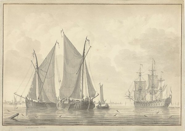 Curator: Right, let's immerse ourselves in this fascinating drawing entitled "Haven met schepen bij Hoorn," which roughly translates to "Harbor with ships at Hoorn." It's from somewhere between 1741 and 1803. Cornelis Brouwer is the artist who created this piece. Editor: The first impression? It’s serenely somber, with this muted palette that evokes a feeling of wistful stillness. I love how the dark inks dance across the paper. Curator: It's interesting you use the word "dance," because notice how Brouwer's use of line directs your eye. The composition emphasizes the ships' rigging; notice their geometry slicing through the airy sky. What's key to remember is Hoorn was a really crucial port city during the Dutch Golden Age. This drawing really gives you a glimpse into that maritime power. Editor: Exactly. Look at how Brouwer orchestrates the scene. The eye is really drawn to the intricacies of those Dutch ships—an empire afloat! You also sense the weight of history within each line. Even those little figures on the rowboats add to the daily maritime life that was unfolding at the harbor. Curator: Indeed. He also used hatching and cross-hatching techniques to build tonal depth, something that definitely would have appealed to collectors and connoisseurs. What really lingers with me is his control of ink washes and use of white space. In that quiet negative space, Brouwer achieves a great balance in his portrayal. Editor: What is it about these monochromatic pieces that speaks volumes, do you think? This drawing has so much character, even without bright color! Curator: It gives room for the imagination to fill the scene. These quiet landscapes and cityscapes have an enchanting impact, with a lasting, understated depth that color might distract from, or overemphasize. Editor: You're absolutely right. It allows one to bring their own interpretation and really engage. Seeing Brouwer's mastery has given me an insight into the power of Dutch maritime painting. Curator: Agreed, a glimpse into maritime heritage portrayed with precision and depth. I am taking away an appreciation of what the power of the era brought.