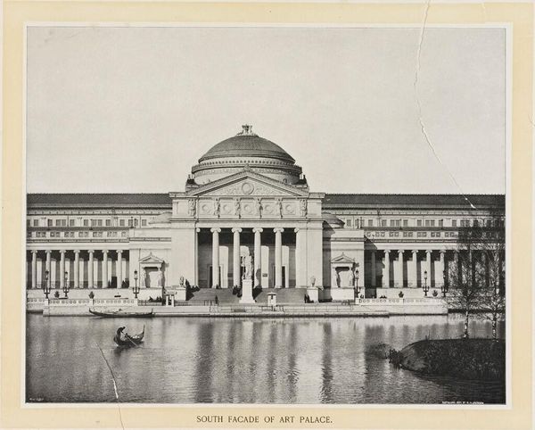 Curator: This photograph by William Henry Jackson captures the Main North Entrance of the Agricultural Building at the World's Columbian Exposition. Editor: It’s imposing, isn't it? All that neoclassical architecture rendered in monochrome gives it a sense of gravity, of some idealized past. Curator: The fair was intended to project a vision of American progress and ingenuity, heavily influenced by the City Beautiful movement. Editor: I see the Winged Victory figure atop the dome, a clear appropriation of classical symbolism denoting triumph and aspiration. It's meant to evoke grandeur. Curator: Indeed. The exposition was a carefully constructed spectacle, a stage for American ambitions on the world stage. But it also reveals deeper societal currents, and its legacy in shaping urban planning is still debated today. Editor: I agree; it’s fascinating how a single image can hold so much cultural weight, reflecting both the dreams and the underlying ideologies of an era.