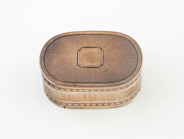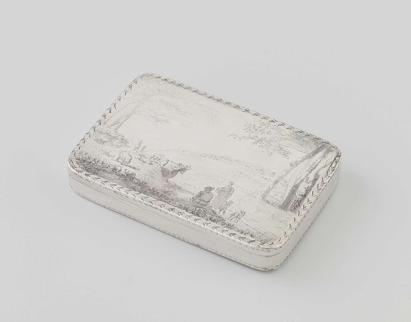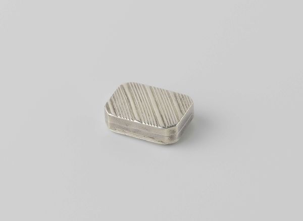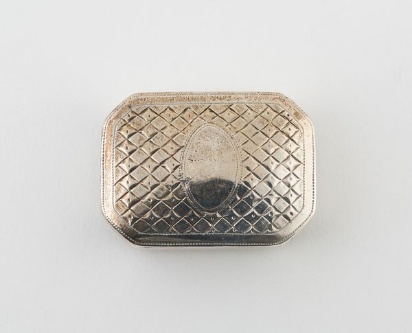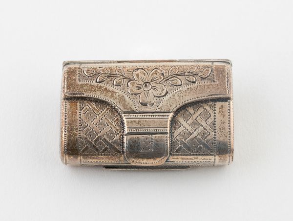 Editor: Here we have William Eley's "Vinaigrette," created around 1810 or 1811, using silver, metal and engraving. It has such delicate patterning; I’m struck by its intimate scale and the aura of discreet luxury it gives off. What can you tell me about this piece? Curator: This "Vinaigrette," as you pointed out, presents us with an intriguing intersection of luxury and necessity, raising questions about the role of gender and class in early 19th century society. These were small, personal containers, usually carried by women, holding a sponge soaked in aromatic vinegar or smelling salts, used to combat unpleasant odors, or as a restorative. Editor: So, it's more than just decorative; it has a practical, even social, function? Curator: Precisely. Think about the social context – rapidly industrializing cities, poor sanitation. This object speaks volumes about the experience of women, particularly those of a certain social standing, navigating those spaces. It gave them agency, a means of control, however small, over their immediate environment. Does that influence your interpretation? Editor: It definitely adds another layer. I initially saw it as purely ornamental. Knowing its practical use and the environment it existed in makes me consider its social implications more deeply. The decorative becomes almost a form of coded message. Curator: Yes! Consider how design choices – the materials, the engraving, the very act of carrying such an item – served as markers of identity, of status, signaling certain values to those in the know. It challenges us to decode these messages within their specific historical framework. Editor: It’s fascinating to consider how an object that seems so simple can reveal so much about the social and lived realities of the past. Thanks, I’ll never look at ornamental pieces the same way again! Curator: Absolutely, it is important to consider decorative works such as this from many different intersecting angles. It changes everything.