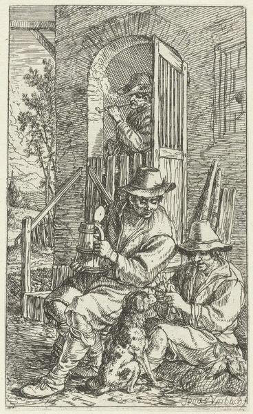 Curator: The scene is set in a small etching, currently held in the Tate Collections. Though the artist is unknown, it's attributed to the British School. Editor: It feels like a captured moment in time—a story unfolding. The lines are so delicate, but there's a distinct contrast between the man's lively posture and the woman's seated position. Curator: That contrast certainly reflects the power dynamics of the era. The visiting man, perhaps a merchant, engages in commerce, while the woman remains tethered to the domestic sphere, spinning. Editor: Yes, and consider the intergenerational relationships. The woman spinning, a younger mother holding a child... it speaks to cyclical labor and the constraints placed upon women across their lifespans. Curator: Absolutely. The dog in the center almost feels like a punctuation mark, drawing attention to the economic exchange and perhaps the reliance of the family on such interactions. Editor: It's interesting how such a simple image reveals these layers of social and gendered history. I'm left pondering the economic realities for women of this time. Curator: Indeed. Attending to these details deepens our understanding of this artwork and its broader historical context.