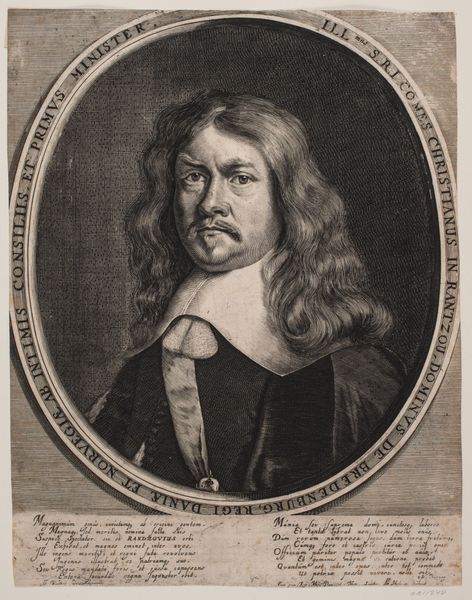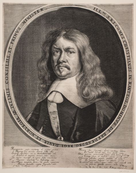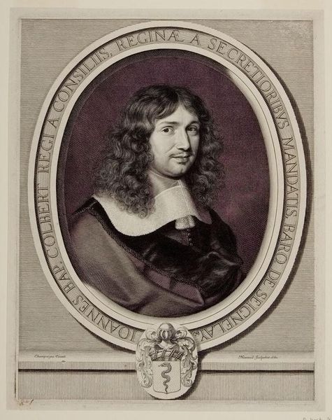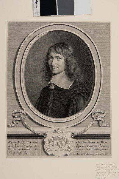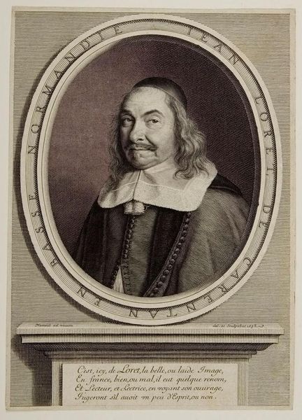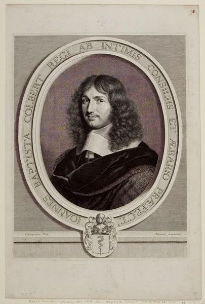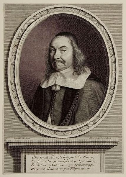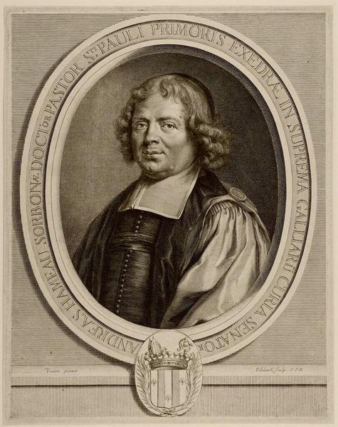Curator: This is Robert Nanteuil's portrait of François Lotin. There's an interesting serenity to Lotin's expression, wouldn’t you agree? Editor: It’s striking how much detail Nanteuil achieves through engraving. I wonder about the labor involved in such fine work. The texture of his robe and collar – clearly expensive textiles, meticulously rendered. Curator: Yes, and consider the symbolism—the sitter's clothing, his place within the oval frame, all speak to status and intellect. The oval is almost womb-like, connoting the origin of wisdom. Editor: I'm curious about the paper itself—its source, the printing process, the dissemination of these images. Portrait prints like this were commodities, symbols of status for both the subject and the owner. Curator: Absolutely, and seeing this image now, we’re participating in a continuation of that symbolic exchange. Editor: It makes me consider the physical reality of artmaking and the social context within which meaning is produced and exchanged.