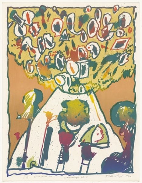 Editor: This is Esq Tom Phillips's "Canto IX," a print of some kind. It’s quite textured. The dark colors and obscured figures give it a very ominous feel. What can you tell me about the piece? Curator: Let's look at the materiality. The rough texture of the print and collage elements speak to a specific mode of production. How does Phillips's use of found text fragments alter the meaning conveyed by the image, considering the labour involved in their collection and integration? Editor: I hadn't considered the collage elements as labor. Curator: Exactly. And what does the visual weight of the red base suggest about the social or political foundations that may be supporting these figures? Editor: That the figures are based on some kind of production or perhaps war? Curator: Precisely. Examining the materials and their manipulation reveals deeper layers of meaning about society and power. I learned a lot looking at it that way.