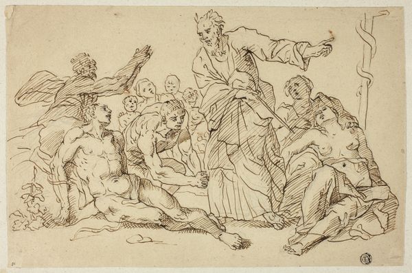 Stefano della Bella made this print, titled "Jugement de Paris," using etching, a printmaking technique, sometime before his death in 1664. Etching involves covering a metal plate with a waxy, acid-resistant substance, then scratching an image into that coating. When acid is applied, it bites into the exposed metal, creating lines that hold ink. Look closely, and you'll see how the etched lines define the figures and landscape. Consider the labor involved: the careful preparation of the plate, the precise drawing, the acid-biting process, and finally, the printing itself. This wasn't a unique artwork; it was made to be reproduced and distributed, a product of its time. Prints like these democratized art, making images and ideas accessible to a wider audience. So, in appreciating this delicate etching, we also recognize the social and economic context of its creation, and the many hands that played a part in its making.