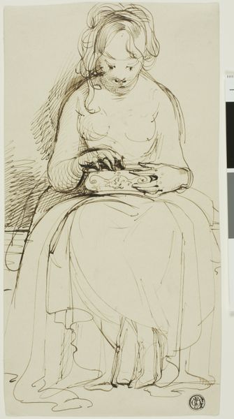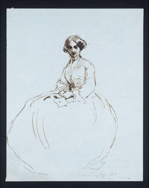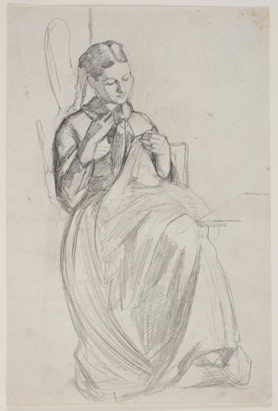 Editor: This is a small pencil drawing by Charles Martin, residing in the Tate Collections. It’s an intimate sketch of a woman, and I find her gaze so melancholic. What do you see in this fleeting moment captured on paper? Curator: It feels like a stolen glance, doesn't it? The loose strokes, the unfinished quality... it whispers of a private moment, a world turned inward. Martin's choice of pencil, the deliberate shading – it's all about suggestion, about the feeling that lingers rather than the precise detail. Perhaps it's a reflection on beauty, fleeting and vulnerable. What do you make of her posture? Editor: The way she’s looking down gives it a very contemplative feel, and the unfinished nature adds to the overall vulnerability. It's quite powerful. Curator: Exactly! It allows us to project our own emotions, our own stories, onto her. Art is often about that shared space, isn't it? We bring ourselves to the canvas, and it reflects us back in unexpected ways.