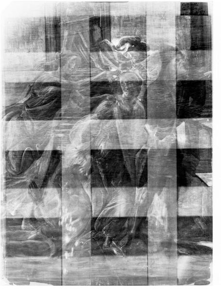 Curator: Here we have an X-radiograph of "Madonna and Child," originally from the Workshop of Antonio Vivarini. The piece resides at the Harvard Art Museums. Editor: It looks like a ghostly blueprint, almost as if the divine figures are trapped within a grid. Curator: Indeed. The grid provides insight into the painting's structure. It's fascinating to consider the Madonna's historical role as an idealized figure, her representation here laid bare by technology. Editor: I'm struck by how the X-ray medium flattens the composition, emphasizing the contrast between light and shadow. Curator: It invites a dialogue about the layers of meaning and cultural significance embedded within this iconic subject matter. Editor: A unique perspective, revealing not just what we see, but what lies beneath. Curator: It's a way of understanding power structures, who gets to be seen, and how we interpret representation.