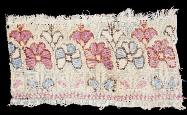 Curator: This intriguing textile, simply titled "Piece," dates back to the 18th century and is housed here at the Minneapolis Institute of Art. The anonymous artisan crafted it from silk through a complex weaving process. Editor: My initial impression is that this textile, despite its age, retains a certain vibrant energy. The floral motifs, rendered in bold reds and blues against the neutral background, create a visually stimulating pattern. There’s a slight asymmetry to the arrangement that prevents it from becoming too predictable. Curator: Indeed. The strategic placement of the bolder hues draws the eye across the surface. We can see a clear application of Pattern and Decoration principles at play here—the celebration of surface ornamentation and the dissolution of hierarchical compositional structures is apparent. The piece moves away from rigid formalist traditions, inviting a different mode of visual engagement. Editor: It's fascinating to consider what societal role this textile played. Textiles of this kind were frequently employed in domestic settings or in religious rituals, serving as functional objects elevated by skilled craft to signify identity, status or faith. Considering the quality of the silk, its role likely extended beyond pure functionality. Curator: Looking closely, the craftsmanship speaks volumes. The way the individual stitches form these dense floral shapes demonstrates both skill and a dedication to the meticulous process of embellishment. I'm also intrigued by how the weave allows for a tactile quality. It departs quite starkly from painting’s emphasis on illusionism. Editor: Agreed. The slight imperfections and the visible wear hint at the object’s history of handling. Each frayed edge and softened color tell a silent story of use and possible cultural exchange. I wonder about the context in which such ornamentation was either lauded as aesthetic achievement or looked down upon due its associations with domestic crafts considered subordinate to "high" art. Curator: Considering its artistic qualities, I'm fascinated by the textile's resistance to formal closure. It challenges a singular interpretation, offering instead an interplay between color, texture and motif. Editor: Yes, "Piece", in its quiet way, challenges historical norms of art and invites consideration of often overlooked craftsmanship practices, which adds layers of political and historical meaning to what might first appear to be simply decorative.