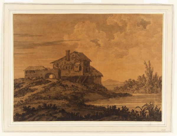 Curator: This is "Italian Coastal Landscape," by Alexander Cozens. The dimensions are modest—less than 4 by 6 inches. Editor: It's evocative! The sepia tones create an atmosphere of nostalgia, a dreamlike quality. Curator: Cozens was celebrated for his innovative methods. He emphasized the imaginative process of landscape painting, developing a technique of blotting ink to suggest forms from which to draw. Editor: Yes, and that process, which is rooted in contingency, speaks to the broader history of landscape as a contested space, always shaped by economic and political forces. Consider how access to coastal spaces... Curator: The materiality itself is so interesting. We see how Cozens manipulated ink and wash, pushing the boundaries of established academic practice. Editor: Absolutely. It's clear how this piece invites discussions around artistic labor and the commodification of landscape. Curator: Indeed. This landscape, small as it is, opens onto vast territories of making. Editor: And reminds us to consider whose landscapes are valued and whose are erased.