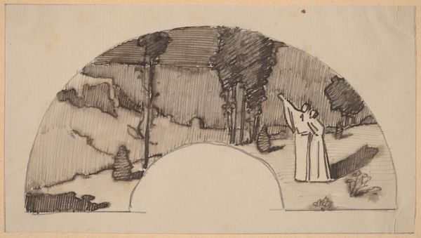Curator: Here we have Charles Sprague Pearce’s, *Study for an Archway*, believed to have been made sometime between 1890 and 1897, created with pen and ink on paper. It's a preliminary sketch of a landscape featuring a distinct archway, which visually dominates the scene. Editor: Immediately, I’m drawn to the way the simple penwork and restricted tonal range really convey a sense of both quiet and melancholy. There's almost a dreamlike quality in its minimalist landscape and its structural representation. Curator: That sense of quietude likely arises from the nature of pen and ink as a readily available, personal medium that emphasizes process over a finished presentation, a very common form for study and documentation. I’m also wondering about Pearce’s intentions here, as archways historically hold socio-political and symbolic meaning. They traditionally represent victory, welcome, or transition. What do you suppose its function might be in his symbolism, do you think? Editor: Given its era, and his likely access to particular paper stocks and ink types, his deliberate use of line might speak more to his engagement with contemporaneous artistic values—the Symbolists come to mind—and less with grand state projects. Maybe this is simply a comment on the human urge to domesticate landscape, even when evoking the quiet grandeur of the arch. Curator: I can see that, absolutely. I suppose too, the function and availability of such art would play a role for artists, as access and display in public galleries really opened new potential venues and ways of working as the 19th Century progressed. And it raises other issues about audience, taste, collecting, and display. I wonder how we see Pearce engaging with those developments in late 19th Century Paris? Editor: That’s the exciting part about preliminary sketches like these— they can give us a privileged insight into an artist’s process of negotiating both the material means, and historical discourses of the time. It invites an almost forensic reconstruction. Curator: Exactly! Looking at *Study for an Archway* again I’m left thinking how accessible such forms could make this piece and others for a broader public, where a painting of such scale could not be housed, such pieces could still speak to people regardless of socio-economic standing. Editor: I think it prompts us to examine those dynamics—of public and private, material and form—in more depth as well. Thanks!