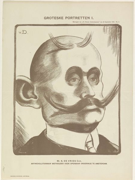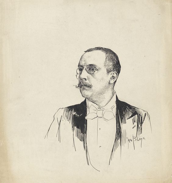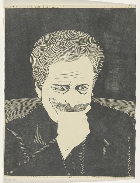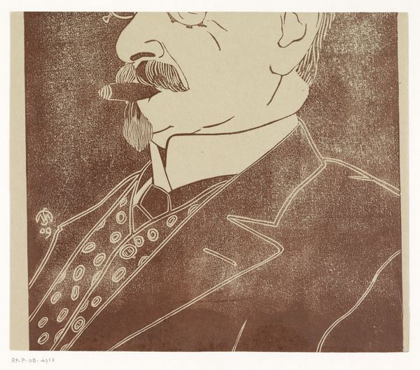 This is Samuel Jessurun de Mesquita’s 'Portret van een onbekende man met sigaar', made with some kind of printmaking process, sometime in the late 19th or early 20th century. The starkness of the black and white is softened by the hatching and curved lines, which have a real graphic quality. The way the lines describe the form, especially in the hair, reminds me of woodcuts. I love the little details, like the polka dots on his tie. The image really captures a personality, though. The man looks severe, but also a little goofy, with his tiny glasses and the cigar jutting out of his mouth. It has the feel of a quick sketch, even though it's a print. The confidence of the line is impressive and the way the artist has captured the essence of the sitter with such minimal means. De Mesquita was a printmaker and teacher, and his work often features bold contrasts and simplified forms, you can also see shades of other printmakers, like Félix Vallotton, in the simplification and boldness of the image.