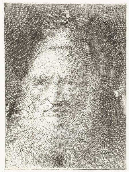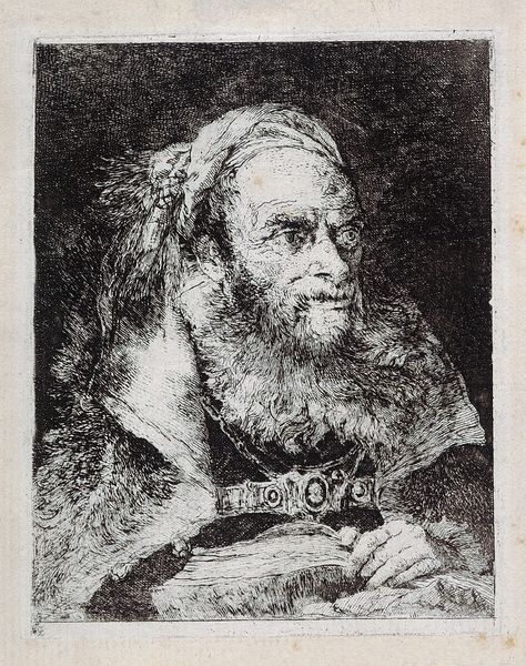 Giovanni Domenico Tiepolo created this print, "Man zonder hoofddeksel", using etching, which captures a beared man from the shoulders up. The composition emphasizes the subject's intense gaze, achieved through a network of fine lines and cross-hatching that model the face and beard. The artist's technical skill transforms a simple portrait into a study of texture and depth. Light plays across the man's face, creating a dramatic contrast that adds to the image's emotional intensity. Tiepolo's mastery is evident in the way he uses line to build form, blurring the boundaries between representation and abstraction. This approach challenges the traditional function of portraiture, inviting viewers to consider not just who the man is, but also how the image itself constructs meaning. Through its formal elements, "Man zonder hoofddeksel" explores the complex interplay between subject and representation. It presents a face, but also engages with the very act of seeing and interpreting.