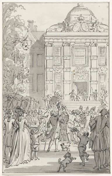 Curator: This is George Cruikshank’s "Randulph and Hilda Dancing in the Rotunda at Ranelagh." Look at the scale and detail! It's so intricate. Editor: It feels like a frenetic, almost chaotic scene. A swirl of figures captured with incredible precision. Curator: Indeed. Cruikshank was known for his social commentary, and Ranelagh Gardens was a very public space, a place for display and societal interaction. Note the architectural setting: its rotunda was a stage for performing social status. Editor: The etching emphasizes the theatricality. The chandeliers, the crowded balconies—it's all carefully composed. The artist’s line creates a sense of depth and dizzying height. Curator: Exactly, these balls were important for social mobility. You could meet new potential partners or business associates. Editor: It's the way Cruikshank uses line to create texture and movement that captivates me. Curator: Yes, the image is a testament to the social rituals of the time. Editor: Seeing the composition this way really highlights how the architecture shapes the entire experience.
