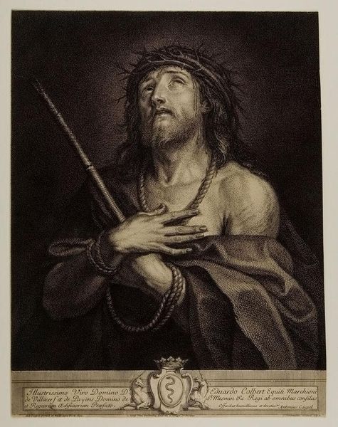 Editor: Here we have Antoine Coypel's "Ecce Homo." It's hard to pinpoint a date, but looking at Jesus, you really feel the weight of the scene. The composition leads your eyes up to the heavens... what do you see in it? Curator: I see a reflection on human suffering, tinged with the hope of redemption. Coypel masterfully captures the duality of anguish and faith. Do you notice how the light seems to caress his face? It's as if divine grace is already descending, even in this moment of profound pain. Editor: That's beautiful. It makes me think of how even in our darkest times, there's a glimmer of hope. Curator: Exactly! And that, perhaps, is Coypel's enduring message. It certainly changed how I see suffering, not as an end, but perhaps as a prelude.