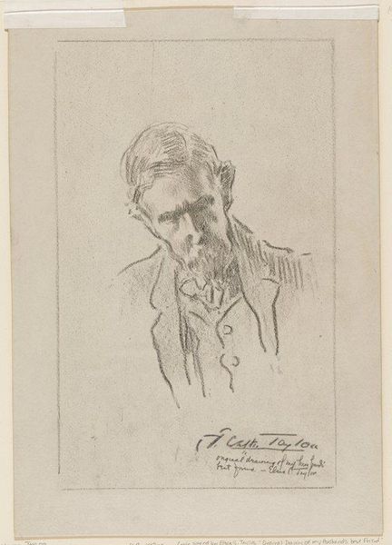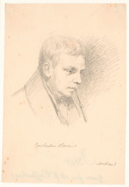 Curator: This is a pencil drawing, a portrait of Frederik Willem van Eeden, rendered by Willem Moerkerk sometime between 1880 and 1955. What do you make of it? Editor: A starkly intimate depiction! There’s a melancholy fragility here. The soft pencil lines and averted gaze project a sense of introspection or even weariness. Curator: I agree. Note the expert use of shading to create depth and form. The subtle gradations in tone describe the contours of van Eeden's face, lending a sculptural quality despite the flatness of the medium. Observe how the artist employs hatching and cross-hatching techniques in the suit to build up form. Editor: And I see van Eeden, a physician and writer associated with the literary movement De Nieuwe Gids, captured through the lens of perhaps his age, social position, but there is that palpable vulnerability that resists pure class readings. Given his advocacy for socialism, the sketch also humanizes his image in ways photography may not have. Curator: Certainly, the choice of graphite contributes to the sense of immediacy and directness. The sketch lines are raw and honest, avoiding the more polished effects we might find in ink or paint, providing us with direct insight into the relationship between Moerkerk and his subject. Editor: Perhaps an intended intimacy—but it feels relevant to consider how this quiet expressiveness intersects with other images of Dutch socialists of the period; the degree of softness perhaps allowed or resisted as they represented themselves within rigid societal structures. Curator: You're prompting me to consider how form can both echo and deviate from period portrait conventions. However, I am most struck by how this portrait speaks to the capabilities of something as humble as pencil. Editor: Yes, its power lies in presenting a multifaceted glimpse of a subject defined by so much more than class or political alignment alone. It truly sparks more questions about representation.