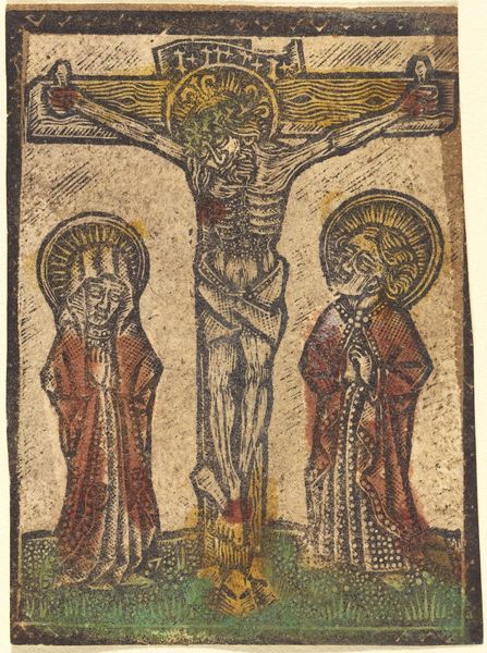 This image of "Christ on the Cross with Angels" was created with woodcut, a relief printing process, by an anonymous artist. Woodcut, or woodblock printing, involves carving an image into the surface of a block of wood, applying ink to the remaining surface, and then pressing paper or fabric against the block to transfer the image. This particular print is hand-colored. You can see the texture of the wood grain throughout, especially in the figure of Christ. The cross itself looks like roughly hewn timber, and the base of the cross is built from geometric blocks. The patterned background is quite complex and visually engaging, and the artist has used a variety of colors to create a rich and detailed image. The labor-intensive nature of the woodcut process, combined with hand-coloring, suggests an intimate and devotional approach to production, making this print both a work of art and an object of faith. Paying attention to the making of this print enriches our understanding of its cultural significance.