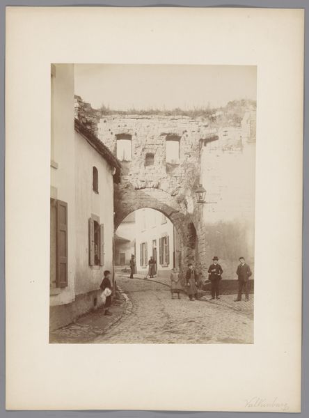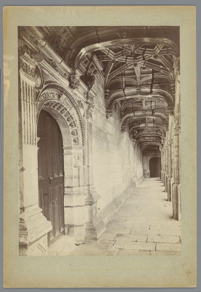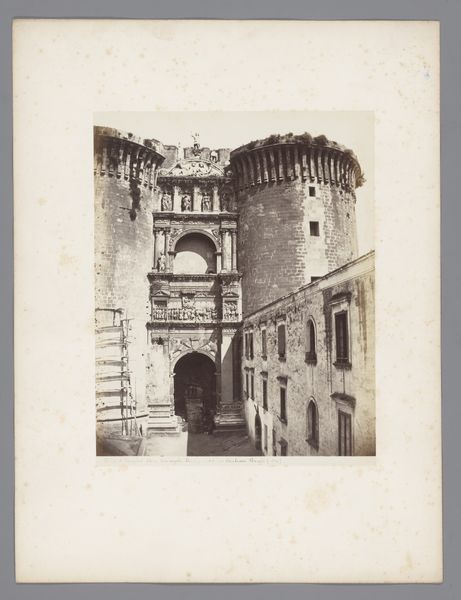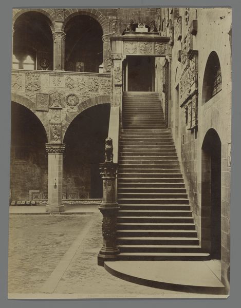 Editor: So, here we have "Piazza Vittorio Emanuele seen under the Arco di San Giovanni in San Gimignano, Italy" by Fratelli Alinari, taken sometime between 1880 and 1910. It's a collotype print. I'm immediately drawn to the geometry here. How the archway frames the street scene. What do you see when you look at this piece? Curator: The most striking aspect is the masterful play of light and shadow. Note how the arch creates a darker foreground, guiding the eye toward the sunlit piazza. The composition relies heavily on geometric forms – the arch itself, the rectangular buildings, the stark lines of the steps – all contributing to a sense of depth and structured perspective. Do you see how the textures of the stonework add another layer of complexity? Editor: I do! The rough texture of the stone creates a nice contrast with the smooth, light-filled open space of the piazza. Curator: Precisely. And the positioning of the figures, seemingly frozen in time, are those elements purposefully arranged within the scene to balance visual weight? These add a human element but are deliberately minimized to maintain the emphasis on architectural form. Consider the use of the albumen print as a medium, contributing to the tonal range, its sepia tones enriching the vintage feel. Editor: So it's about the contrasts and the visual organization rather than… a story. Curator: The narrative is secondary here. This work privileges the visual relationships: light and shadow, texture and line. These create meaning that supersedes the depiction itself. It's about the relationships of these compositional parts. The arch acts not just as a portal but a signifier, one which dictates the manner in which the composition is perceived. What do you think is being communicated in this controlled perspective? Editor: It’s like Alinari is saying, "look at this space, how it's constructed, how light interacts with it," instead of focusing on what's *happening* in the space. The clarity and stark structure of light in the arch are interesting. Curator: Exactly. Focusing solely on the inherent formal relationships, without recourse to external contexts, allows us to appreciate Alinari's masterful command of photographic elements and compositional tools. I’m particularly struck by the texture; I think that will stick with me the most. Editor: Yes, looking closely really makes you appreciate how much the visual arrangement shapes our understanding, the balance of lines, shadows, and forms shaping perspective above all else.