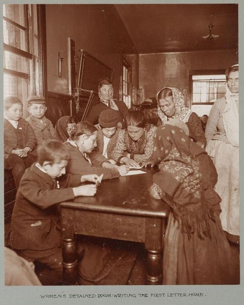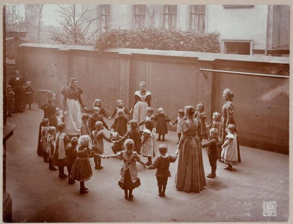 Curator: This is Waldemar Titzenthaler's photograph, "The Orchestra," taken at a Froebelhaus kindergarten in Berlin. I find its sepia tones immediately calming and nostalgic. Editor: Indeed, the composition is quite striking. The artist has captured such a charming scene with the children grouped in this manner, their instruments creating this lovely rhythm. Curator: The image encapsulates the progressive educational ideals associated with Friedrich Froebel, emphasizing creative expression and community engagement, especially for the working class. Editor: Notice the interplay of light and shadow across the children's faces and the instruments. There is a clear emphasis on the geometric forms of the instruments and the arrangement. Curator: Absolutely, and consider how these kindergartens sought to uplift children, regardless of their socioeconomic background, empowering them through art and music. Editor: A testament to a specific moment, one captured with such a keen eye for texture and structure. Curator: This image prompts reflection on how far we've come in democratizing arts education. Editor: It certainly resonates on several levels, both visual and contextual.