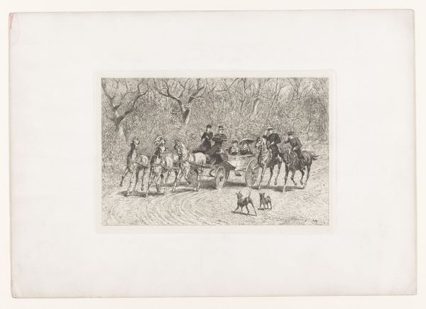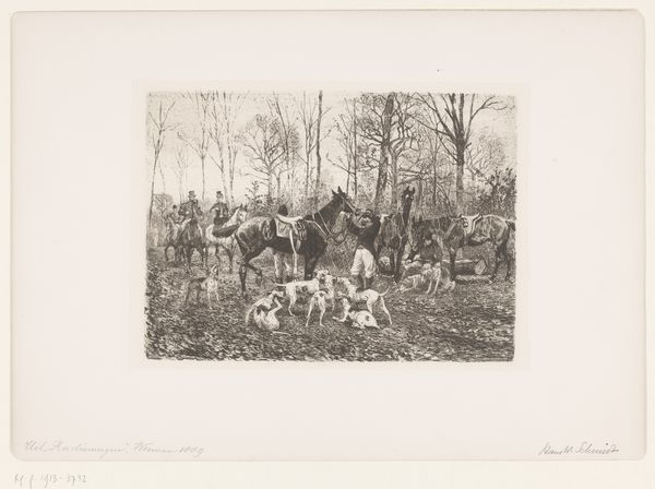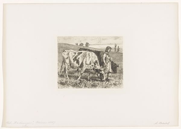 Editor: Here we have Hans W. Schmidt’s 1887 etching, "Schaapherder", held at the Rijksmuseum. The tonal range is striking, creating an overall subdued and quiet mood. How do you read the composition? Curator: Note how Schmidt deploys etching to establish texture and spatial depth. See the arrangement of light and shadow and its influence on creating dimensionality; dark strokes form the figures of the sheep in the foreground, contrasting sharply with the distant pale horizon. We may observe a balance here, or perhaps tension, created through the use of asymmetry in light. Editor: The sheep really do appear to advance from the print, it’s wonderful! Can you tell me more about this tension between light and dark? Curator: Consider the distribution of visual weight. Notice that although the etcher renders the animals mostly in darkness, they are strategically placed to guide the eye from left to right, deeper into the background. This compositional choice—darkness against a brighter background—gives a palpable sense of recession into space, with depth constructed by a system of formal relationships. How do the lines interplay, directing the viewer's gaze? Editor: The lines seem to originate from a central focal point, then spreading out and converging towards the upper portion. How remarkable! Do you think the distribution is purposeful, or are there possibly imperfections to be noted? Curator: It appears that way, certainly, but bear in mind we may never grasp an artist’s full intent. And any alleged imperfections still form an integral and inextricable aspect of the completed image. However, studying the formal relationships helps me clarify my experience with this picture. Editor: I can see what you mean. Thinking about the composition and how it directs our eyes offers new insights into the work. Thanks so much! Curator: Indeed. Such study refines not just the artwork itself but also one's own critical capacity for apperception and understanding.
