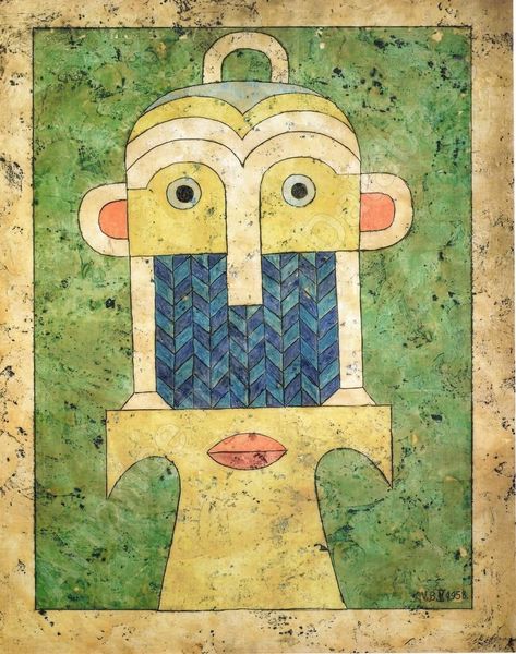 Curator: Standing before us is "There," a 1949 mixed-media piece by Victor Brauner. Editor: My initial impression is one of symbolic density and a kind of earthy surrealism. It’s vibrant, almost unsettlingly so. The central figure dominates with this mix of almost cartoonish yet very powerful imagery. Curator: Brauner’s works often delved into a highly personal symbology, drawn from Romanian folklore, alchemy, and a response to the political turmoil of his time. The figure is, in itself, an amalgamation of signs. Note the composite character. Editor: The obvious tension here comes from the figure's posture and those very different colors clashing—that sharp green against the earth tones and vibrant details—suggesting inner conflict, perhaps? Curator: Precisely. And consider the bestial representation atop its head: a protective familiar but perhaps also an indication of savage potential barely contained, rendered in flat, stylized forms reminiscent of folk traditions, the fish, the humanoid figure within the body. Editor: I think the symbolism is pretty potent. That inner figure feels trapped, almost embryonic, reflecting perhaps Brauner’s own sense of being confined, politically or even creatively during this tumultuous period of history. But I also want to emphasize how this represents societal restrictions projected on a human experience of conflict and tension. Curator: Indeed. Brauner saw art as a form of prophecy, of uncovering truths hidden beneath the surface. "There" resonates as both a deeply personal vision and a reflection of larger societal anxieties through encoded imagery. I’m always captivated by the enduring power that visual language possesses to communicate complex, timeless messages about what binds the world, especially when so much rests beneath the veil. Editor: Absolutely. And beyond Brauner's personal struggles, I'm drawn to the universal message this painting projects about feeling entrapped by a society imposing restrictions while carrying the responsibility for those same burdens, highlighting how the consequences of our realities can feel utterly insurmountable.