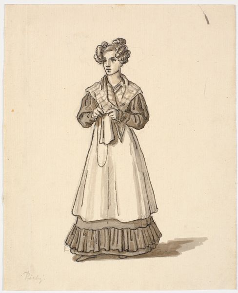 Curator: This drawing, crafted by Martinus Rørbye in 1830, is titled "Marieth Gullich's Datter Lia af Svenne Anex til Fleibergs Præstegjæld i Numedalen." It's currently housed here at the SMK. Editor: It's quite delicate. I'm immediately drawn to the precision of the pencil work, especially the detail in the figure’s garments and how Rørbye captured the texture of the fabrics. Curator: Indeed. Rørbye, during his travels through Norway, was clearly interested in documenting local customs and costumes. He was actively participating in constructing an image of regional and national identity through art. Editor: And you can see that material reality taking shape, literally. The tight lines of the jacket, contrasting with the flowing skirt—how are those materials sourced, made, consumed within her community? The slight sheen he captures must depend upon thread and dye quality. Curator: Precisely. The act of sketching these figures serves a political function; these images entered circulation at a time when Norway sought its identity and separation from other regional powers. Genre paintings and figuration offered a distinct mode of representing the local and the real. Editor: It feels more like careful observation than romantic idealization. Her hands clasped modestly, the plain but sturdy clothes—Rørbye focuses on the details of everyday life. Who was she making these garments for, and what labor did it represent? Curator: The portrait also functions as an ethnographic study, attempting to preserve and understand the practices of rural life as a modernizing Norway became integrated in global flows of manufacturing and political movements. This image certainly caters to the emerging nationalism of the era. Editor: Absolutely. Even in the simple medium of pencil, we glimpse a network of labor, skill, and consumption tied directly to social life. Looking at it, I'm compelled to examine the material culture it depicts, not only what is represented, but its social circulation too. Curator: Thinking about it, what I find striking is that we still connect with it on an aesthetic level after so many years, perhaps because the material realities remain in some ways unchanged, and some of our core values around family, community, and representation resonate today. Editor: Yes, in looking at the techniques and historical record, one can understand how art like this played a role in constructing broader cultural values related to labor and national character.