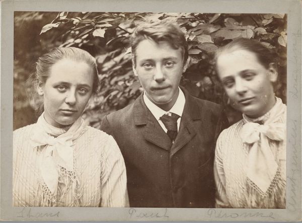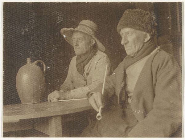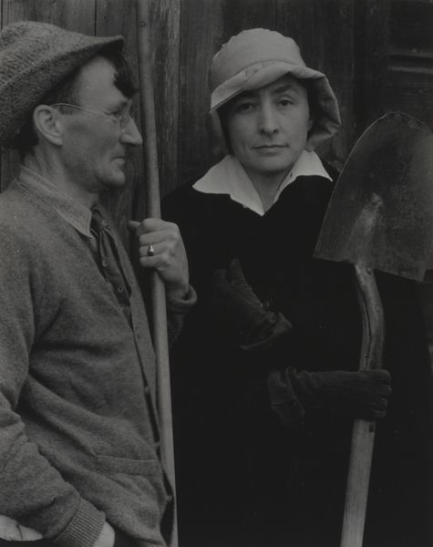 Editor: Here we have Alfred Stieglitz's photograph "Georgia O'Keeffe and Donald Davidson," created in 1924. It’s a black and white portrait. I'm struck by the contrast between the soft light on O’Keeffe's face and the rough texture of the background and tools they are holding. What compositional elements stand out to you? Curator: Note the meticulous placement. The spade bisects the visual plane, directing our focus and controlling the compositional arrangement. Similarly, observe how light sculpts their faces; each is presented as a unique study in form and tonal value. What relationship exists, do you think, between the texture of the wooden wall and the details of their clothes? Editor: I see what you mean! The wood’s vertical lines lead the eye upwards, whereas the clothes appear as softer geometric shapes. It's like a study in contrasts, yet unified by the monochrome palette. The details give dimension, especially considering the date of this photograph. Curator: Precisely. Consider the framing; Stieglitz directs the viewer’s perspective using a balance of negative space and form. In structuralist terms, you might explore how the tools function as signifiers within this visual language. How do these signifiers help decode the artistic intention? Editor: So, the tools could represent their roles or identities, adding a layer of meaning beyond the purely visual? They give clues as to the personalities of the individuals and make up an important part of the image's structure. Curator: Exactly. Through careful analysis of its visual and structural components, one can more closely observe and deconstruct the essence of the photograph. Editor: That really opens up a new way of looking at portraiture. Thank you!