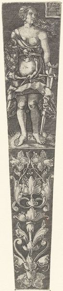 This dagger sheath with a gentleman holding a parrot was made by Heinrich Aldegrever. The ornamental print was etched onto iron, a common material in Europe in the 16th century. Aldegrever, a printmaker and goldsmith, was clearly skilled in metalworking, as we can see in the remarkable level of detail on the surface of the iron plate. The etched lines create tone and texture in the depiction of clothing, botanical forms, and the figure of a well-dressed man holding a bird. Daggers were both weapons and fashion statements. And what better way to show off than with a stylish sheath? We might even say that Aldegrever blurs the line between functionality and artistry. He transforms an everyday object into something of beauty, reminding us that labor, materials, and function are all part of a much bigger picture.