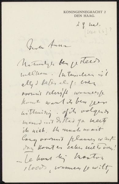 This is a letter, "Brief aan Anna Dorothea Dirks", penned by Isaac Israels. Look at the way the ink flows, how each word seems to dance across the page! It’s like watching a calligrapher in motion, each stroke deliberate yet somehow spontaneous. The colour is muted, faded ink on aged paper. The texture? Smooth where the ink sits, rough where the fibers of the paper resist. The loops and swirls, thick in some places, thin in others, reveal the pressure of Israels' hand. Notice the way the lines sometimes overlap. It reminds me of how we layer paint, building up meaning through a series of gestures. That one looping flourish on the first line? It's a little exuberant, a burst of energy that hints at the artist's personality, or maybe just his mood that day. This letter reminds me of Cy Twombly’s work. In art, as in life, it’s often the imperfections, the irregularities, that make things interesting.